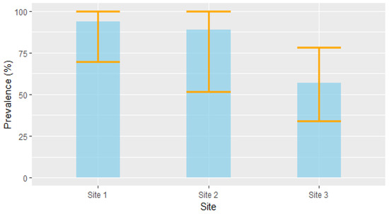 Based on the RT-PCR results, 35 of the 46 voles were positive for Leptospira DNA, resulting in an overall prevalence of 76% (CI95% [61%, 87%]). Although the differences were not statistically significant, prevalence tended to vary among the study site: site 1 had a prevalence of 93.7% (CI95% [69.7%, 99.8%], n = 16); site 2 had a prevalence of 88.9% (CI95% [51.7%, 99.7%], n = 9); and site 3 had a prevalence of 57.1% (CI95% [34%, 78,2%], n = 21) (Figure 3).
