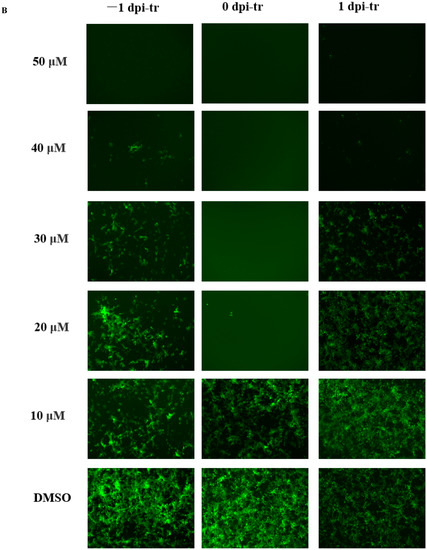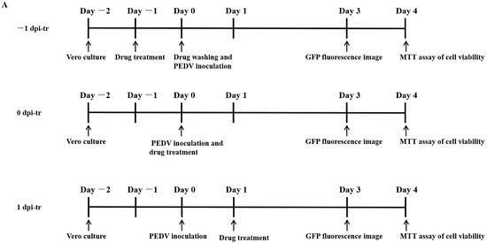 Vero cells were seeded to 96-well plates (2 × 104 cells/well) and incubated (37 °C, 5% CO2-enriched atmosphere) for 24 h before adding MAG (−1 dpi-tr) at concentrations of 10, 20, 30, 40 and 50 μM. After a further 24 h incubation, the medium containing MAG was removed and the wells washed three times with PBS. Cells were then infected with rPEDV-∆ORF3-GFP (MOI 0.01) and incubated for 2 h (37 °C, 5% CO2-enriched atmosphere) to allow the virus particles to combine with receptors on the cell surface. Any unbound virus was then removed, the infected cell layers were washed and immersed in fresh medium, and the well-plates were incubated for a further 3 days. Alternatively, MAG was applied to the Vero cells immediately after (0 dpi-tr), or 24 h after (1 dpi-tr) infection with the virus (Figure 2A), until the test was terminated. All the samples were subjected to GFP fluorescence imaging 3 dpi, and virus inhibition rates were assessed 4 dpi using the MTT assay.
