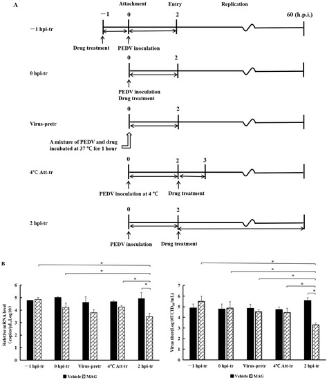 To investigate the effects of MAG on different phases of the PEDV replication cycle, the wells of six-well plates were seeded with Vero cells (4 × 105 cells/well), incubated (37 °C, 5% CO2-enriched atmosphere) to 90% confluence, and treated with MAG as follows: (Figure 3A).