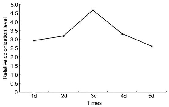 We assessed the ability of the root colonization of the H18-1-1-t and H18-1-1 WT strains using qRT-PCR. The colonization ability of the H18-1-1-t was higher than that of the H18-1-1 WT strain; it peaked on day 3 (Figure 6). The results showed that the overexpression of the Taugt17b1 gene in T. atroviride significantly increased their colonization ability.