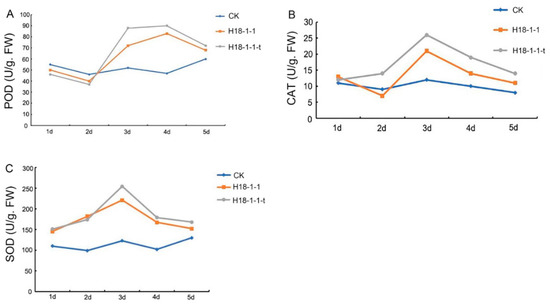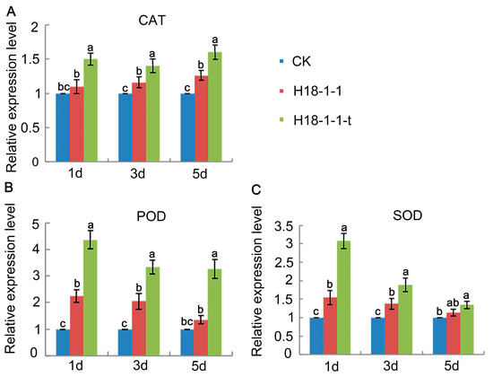 To investigate the effect of Taugt17b1 overexpression on the defense enzyme activity, we examined the POD, CAT, and SOD activity of the wheat treated with H18-1-1-t and H18-1-1. The results showed that the enzyme activities (SOD, POD, and CAT) of wheat plants treated with H18-1-1-t and H18-1-1 were higher than those treated with water (CK). In addition, the enzyme activities of the wheat plants treated with H18-1-1-t were higher than those treated with H18-1-1 (Figure 7b,c). Furthermore, the expression levels of the plant defense enzyme coding genes—POD, SOD, and CAT—in Pak Choi (Brassica chinensis) were determined by greenhouse and field experiments. The increase in their gene expression caused by the treatment with the H18-1-1 WT and H18-1-1-t strains peaked on the first day. POD expression was increased in the Pak Choi treated with both H18-1-1 WT and H18-1-1-t, as compared to the control group. However, H18-1-1-t caused a greater increase in POD expression than H18-1-1 WT (Figure 8).