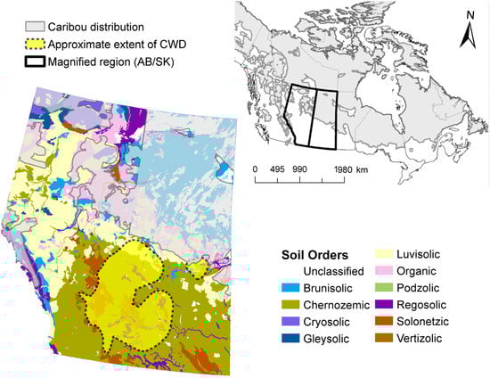 Soil order map of Western Canada (Alberta and Saskatchewan) with range of caribou (Rangifer tarandus spp.) and CWD-endemic region. (Soil order map source: Agriculture and Agri-Food Canada, 2010, v.3.1, accessed through ESRICanadaEd).