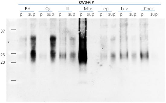 Binding capacity of soil minerals to WTD-CWD prions. Identical amounts of 10% infected deer brain homogenate (BH) were incubated with water (control) and 15 mg/mL suspension of soil minerals quartz (Qz), montmorillonite (Mte), Illite (Ill) and soils Leptosol (Lep), Luvisol (Luv) and Chernozem (Cher) overnight at 4 °C. Samples were fractionated through a 1M sucrose cushion to separate bound prions from unbound; pellet (p.; bound prions) and supernatant (sup; unbound prions) were analyzed by Western blot using mAb Bar224.