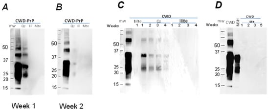 The initial mineral columns used pure soil minerals to determine how minerals with different binding capacities alter prion migration. Brain homogenates from CWD-infected or -uninfected (control) animals were applied to the surface of the columns. Precipitation, which induces water downdrafts in the soil profile and the real moisture regime of the soil, was modeled by weekly watering. Leachates were collected from the bottom of the columns and analyzed for PrP using immunoblotting (Table 2, Figure S2). PrP from quartz columns with the infected or uninfected BH was detectable in the leachate after the first week, indicating that both PrPC and PrPCWD migrated through the quartz columns (Figure 3). PrP continued to be detected in the quartz column leachate for the next 4 weeks with the intensity of signal decreasing from week to week. PrPCWD was detectable until the 5th week of irrigation, while PrPC was detectable in the leachate only during the first two weeks of irrigation. For the other mineral columns (illite, mte), the PrP was not detectable in leachates by immunoblot throughout the 6 weeks (Figure 3).