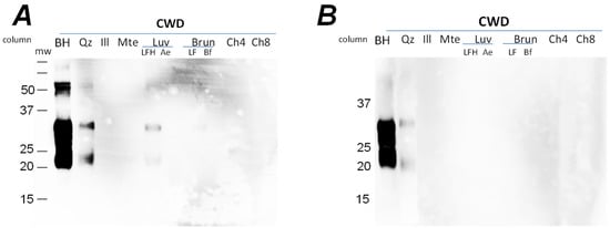Leachate obtained at the first (A) and second (B) week from all 9 columns (column experiment 2): Qz—quartz; Ill—illite (50%) + quartz; Mte—montmorillonite (50%) + quartz; Luv—northern Luvisol; horizons LFH and Ae; Brun—mountain Brunisol; horizons LFH and Bf; Ch—Chernozems. Approximately 5 mL of leachate was obtained from each column; 50 μL of leachate was boiled at 100 °C with 5 × Laemmlii buffer and analyzed by Western blot using mAb Bar224 (1:10,000). Initial amount of BH applied for the columns was used as a positive control (first lanes on each panel).