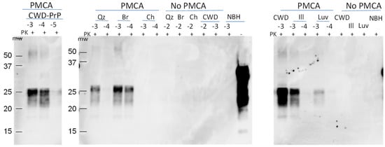 PMCA seeding activity of leachates from the columns. Second round of PMCA: the amplification of PrPCWD in leachates obtained at the third week with quartz (Qz), illite (Ill), Brunisolic Bf horizon (Br), Luvisolic Ae horizon (Luv) and southern Chernozem (Ch) (experiment 2) columns. CWD-PrP (−3; −4; −5)—amplification control; Qz, Br, Ch, Ill, Luv—samples from column; NBH—uninfected brain homogenate diluted 1:10 in the PrPC substrate; no PMCA control. The same samples were stored at 37 °C without sonication. The samples were PK digested (50 µg/µL) and analyzed by WB using mAb Bar224 (1:10,000).