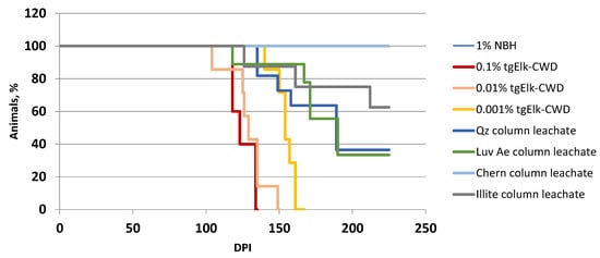 Infectivity of leachates obtained from the columns. Survival curve of tgElk mice i.c. inoculated with leachates obtained at the second week from columns with quartz (Qz), illite, Luvisolic Ae (Luv) and Chernozemic Ah (Cher) horizon. Dilution of infective tgElk CWD-BH (0.1%, 0.01%, 0.001%) was included as a control; NBH—uninfected tgElk BH.