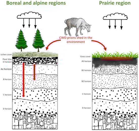 Prion fate in soils in different ecozones. In boreal and alpine/tundra regions, prions (PrPCWD labeled as a red spot or arrows on the cartoon) that passed plant litter will move to lower soil horizons and become unavailable for cervids; in prairie regions, prions would be bound in upper soil horizons, remaining biologically available.