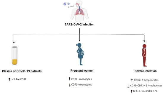 During pregnancy/COVID-19 coincidence, the frequency of CD39 or CD73 in T lymphocytes or B lymphocytes was not changed. However, pregnant women (COVID-19 positive) had a greater proportion of CD39+ monocytes than non-pregnant women COVID-19 positive) []. Conversely, the CD73+ monocyte percentage decreased in COVID-19-positive pregnant women []. The difference in the frequency of these cells was associated with a difference in the inflammatory responses []. Another study showed that the expression of CD39, but not CD73, was downregulated in monocytes of infected patients compared to healthy subjects []. These results indicate that CD39-positive cells are involved in COVID-19 infection (Figure 1).