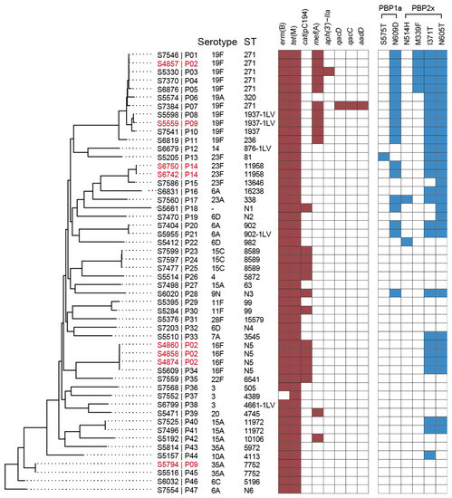 Phylogenetic analysis of S. pneumoniae isolates in our hospital correlated with the distribution of resistance genes (red–white heatmap) and resistance mutations (blue–white heatmap). The serotypes and STs of the isolates are also displayed. The patient numbers are attached after the isolate numbers, and the patients with more than one isolate are in red. N1 to N6 stand for the six new STs we identified.