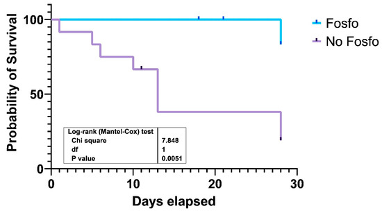The Kaplan–Meier curve for 28-day survival of patients treated with a fosfomycin-containing regimen or other antibiotic regimens is shown in Figure 1. Inclusion of fosfomycin in the combination therapeutic regimen was associated with significantly better survival as compared to non-fosfomycin-containing regimens (p = 0.0051).