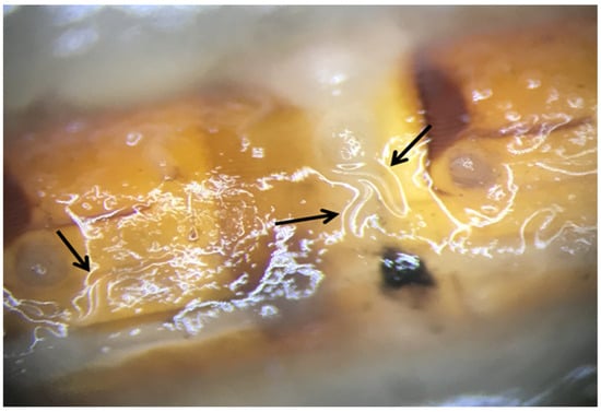 Emerging infective juveniles (black arrows) of Steinernema feltiae from the body of Agriotes rufipalpis larvae.
