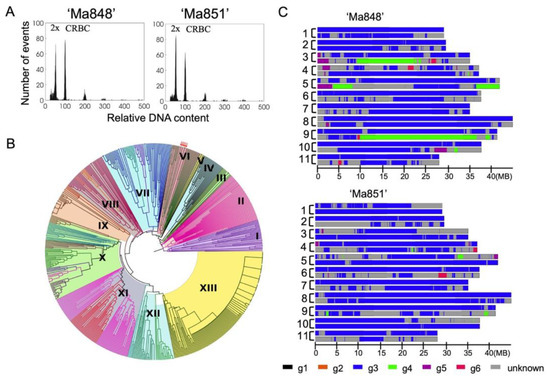 Suspensions of intact cell nuclei of ‘Ma848’ and ‘Ma851’ were prepared from fresh leaf “cigars”. Nuclear DNA was stained by DAPI (4′,6-diamidino-2-phenylindole) and relative fluorescence intensity of stained nuclei was analyzed using Partec PAS flow cytometer (Partec, Münster, Germany) equipped with a high-pressure mercury lamp as excitation light source as per a previous study [33]. Chicken red blood cell nuclei (CRBC) were included in the samples and served as an internal reference standard.