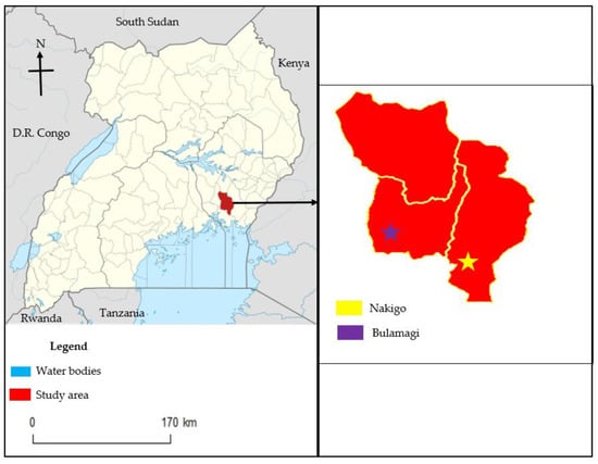 The study was conducted in Bulamagi and Nakigo sub-counties in Iganga district in the eastern region of Uganda (Figure 1). The coordinates for Iganga district are: Latitude: 0°36′33.01″ N, Longitude: 33°28′7.00″ E. Districts along its boarders are Bugiri to the east, Namutumba to the northeast, Kaliro to the north, Kamuli to the northwest, Jinja to the west, and to the south lies Mayuge. The district has an average annual temperature of 22.3 °C and an average annual rainfall of 1313 mm, which are optimal for the survival of the livestock and disease vectors such as ticks. There are two relatively drier seasons (December to March and June to July) [18]. There is sufficient rainfall throughout the year to sustain man and animals except in very rare circumstances that sometimes lead to drought.