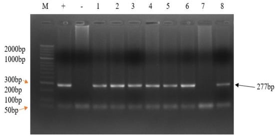 A representative 2% agarose gel showing T. parva p104 gene nPCR amplicons. Lane M: 50bp DNA ladder (N32361, Biolabs), Lane +: positive control (T. parva Muguga stock DNA), lane −: negative control (distilled water), lanes 1–6 and 8: T. parva positive samples Lane 7: T. parva negative sample.