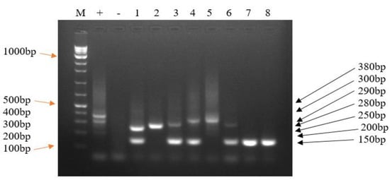 A representative 2% agarose gel showing T. parva nPCR amplicons using MS7 marker. Lane M: 100bp ladder (Biolabs), Lane +: positive control (Muguga cocktail vaccine isolate DNA which amplified three alleles of 200 bp, 300 bp, 380 bp), lane −: negative control (distilled water), Lanes 1–8: field sample isolates. Lanes 1, 2, 3, 5 and 6 were from vaccinated cattle whereas Lanes 4, 7 and 8 were from non-vaccinated cattle isolates. The DNA from field isolates (1–8) amplified five alleles, 150 bp (Lanes 1, 3, 4, 6, 7 and 8), 250 bp (Lane 1), 280 bp (Lane 2), 290 bp (Lane 3 and 6), and 300 bp (Lanes 4 and 5).