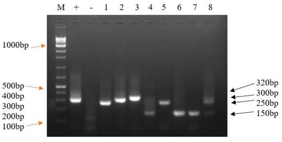 A representative 2% agarose gel showing T. parva nPCR amplicons using MS19 marker. Lane M: 100 bp ladder (New England Biolabs, Ipswich, MA, USA), Lane +: positive control (Muguga cocktail vaccine isolate DNA which amplified one allele (300 bp), lane −: negative control (distilled water), Lanes 1–8: field sample isolates. Lanes 1, 2, 3, 5 and 6 were from vaccinated cattle whereas Lanes 4, 7 and 8 were from non-vaccinated cattle isolates. The DNA from field isolates when genotyped with minisatellite marker (MS19) amplified four alleles of sizes; 150 bp (Lanes 4, 6, 7 and 8), 250 bp (Lane 1), 300 bp (Lanes 2, 4, 5 and 8) and 320 bp (Lane 3).