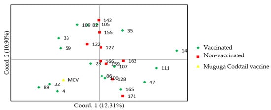 The principal component analysis (PCA) depicted close genetic relatedness of T. parva parasite isolates from recently vaccinated and non-vaccinated cattle since they always scattered together. This shows that there was sharing of strains between vaccinated and non-vaccinated cattle. This has been confirmed as a possible scenario in the field where ticks aid in transferring T. parva parasites between cattle that share common grazing ground [10,26]. However, isolates from vaccinated cattle were more closely related to the strains from Muguga cocktail vaccine, as shown by the clustering in the lower left quadrat (Figure 5). The low genetic variation of 4% among the two populations also confirms that the two populations shared similar genetic composition. The parasite isolates scattered in all the four quadrants, implying that the T. parva parasites were genetically diverse in the field, which could be induced by genetic recombination between field parasites and vaccine parasites [30]. The principal component analysis plot findings were consistent with the high level of variation existing within individual parasite isolates in a population (96%), implying that there was high genetic diversity in each individual population. This is similar to findings by Magulu et al. [26].