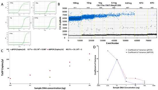 The total volume of the ddPCR mixture was kept at 20 µL which included primers (0.9 µM forward and reverse primers), probes (0.2 µM), DNA (100 ng), and 1× ddPCR super mix (Bio-Rad, Hemel Hempstead, UK). The reaction was carried out in duplicate. Droplet creation, reading, and data analysis for ddPCR were performed using the Bio-Rad QX100, as previously reported [29].