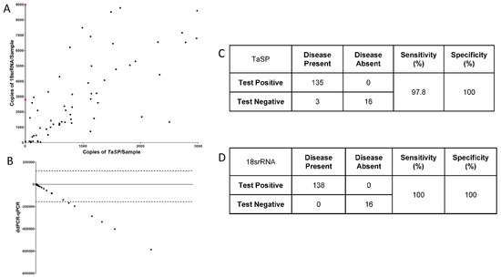 Screening of Theileria parasite in clinical bovine samples: (A) The scatter plot represents the copies/µL of TaSP and 18s rRNA in clinical samples (N = 151). (B) Bland-Altman plot comparing the efficiency of ddPCR-based diagnosis in comparison to qPCR across the samples (N = 151). The efficiency of both primers. (C,D) Sensitivity and specificity of TaSP and 18s rRNA primers when used in ddPCR for screening clinical samples.