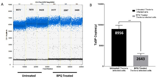 Identifying T. annulata infection in the field is challenging, making tracking the treatment response even more difficult. Since some of the treated animals carrying the parasites remain undetected, they become carriers for ticks, leading to further disease propagation. ddPCR was performed on DNA samples from treated and untreated Theileria-infected cell lines (TA) with BPQ to evaluate the treatment’s effectiveness. After 72 h of BPQ therapy, DNA was extracted from the cell lines to monitor the parasite growth based on the TaSP gene expression. Using ddPCR, the number of TaSP copies/µL before and after BPQ treatment was determined. The number of parasite DNA copies dramatically reduced in treated samples in contrast to untreated ones. After 72 h, TaSP gene copies in DNA were measured to be only 2643 copies/µL in treated samples in comparison to 8956 copies/µL in control cell lines. (Figure 3A,B).