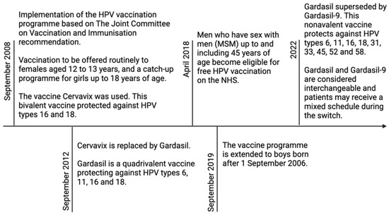 The NHS vaccination programme currently offers the first HPV vaccine dose to children aged 12 to 13 years, with their second dose 6 to 24 months later [80]. These vaccinations are provided free of charge by the NHS for girls born after 1 September 1991 and boys born after 1 September 2006 [80]. Previously, there was a longstanding vaccination programme exclusively for girls until its extension to both sexes in September 2019 [80]. This was due to beliefs of herd immunity and indirect protection for boys against the HPV infection [81]. This does not equally safeguard men who have sex with men (MSM), and this population was, therefore, still unprotected from HPV-associated cancer risk [81]. Since early 2018, the NHS offers eligible MSM, who are 45 years old and under, free HPV vaccinations [80]. If an individual is eligible for the HPV vaccine, but does not opt for vaccination when offered, it remains available on the NHS at no cost to the individual until their 25th birthday [80]. It is important to note that three doses of the vaccine are recommended for immunocompromised persons and those who received their first dose at 15 years of age or older [82].