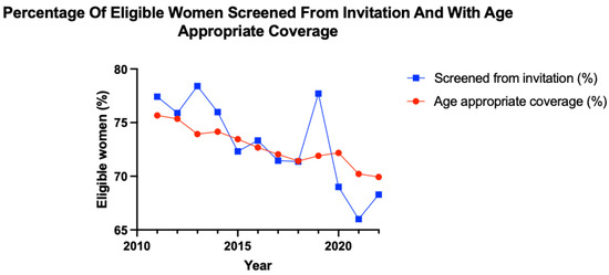 Figure 2. Graph demonstrating the changes in the percentage of women screened from invitation and percentage of women with age-appropriate coverage from April 2010 to March 2022.