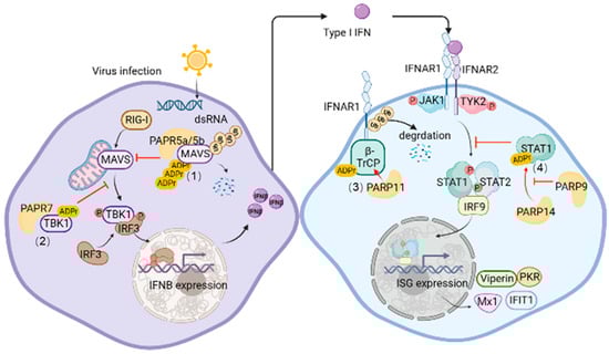 ADP-ribosylation in IFN-I production and IFN-I-induced JAK-STAT signaling pathway. During viral infection, (1) TNKS1 and TNKS2 interact with MAVS and catalyze its PARylation, leading to the degradation of MAVS and impairment of IFN production. (2) PARP7 targets TBK1 and catalyzes it mono-ADP-ribosylation, which suppresses the activation of TBK1 and downstream events. (3) PARP11 mono-ADP-ribosylates β-TrCP and mediates IFNAR1 ubiquitination and degradation, thus acting as a negative regulator of IFN-I response. (4) PARP14 catalyzes mono-ADP-ribosylation of STAT1 and prevents its phosphorylation, thus repressing the IFN-I response. PARP9 suppresses PARP14-mediated MARylation of STAT1, which sustains STAT1 phosphorylation. (Created with BioRender.com (accessed on 16 January 2023).