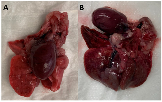 Heart and lungs dissected from Wistar rats at the end of the experiment ex vivo. In (A), a rat treated with moxidectin in M-S-P has normal heart and lungs, while a control rat with a moderate burden of mature A. cantonensis is shown in (B) on the right.