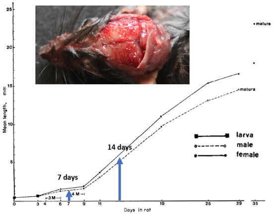 Growth of A. cantonensis in experimental white Wistar rats; 3 M = 3rd moult; 4 M = 4th moult. The blue arrows indicate the size of the migrating larvae at 7 days and 14 days when they would be exposed to moxidectin following the administration of Simparica Trio™ by ingestion following gastric lavage. Inset: photo of a wild rat after removal of the calvarium to demonstrate young adult worms (L5) in the subarachnoid space overlying the cerebrum. Photograph courtesy of Lydia Tong and Derek Spielman, Taronga Zoo; original diagram adapted from Manoon Bhaibulaya’s classic paper in 1973 [25], with modifications.