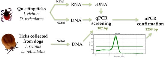 Scheme of the experimental methodology. Questing ticks or ticks retrieved from dogs were used to detect the presence of Neoehrlichia mikurensis using qPCR and nPCR methods.