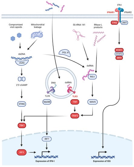 In the cytosol, multiple receptors exist to detect viral DNA and other danger signals, such as dsRNA species. Notable here is the cyclic GMP-AMP synthase–stimulator of interferon genes (cGAS-STING) axis. cGAS recognizes dsDNA from the viral genome or mitochondrial DNA leaked into the cytosol [24] to produce 2′3′-cyclic GMP-AMP (2′3′-cGAMP) as a second messenger to activate STING on the endoplasmic reticulum [25,26,27]. STING then signals through serine/threonine protein kinase 1 (formerly known as TANK-binding kinase 1, TBK1) and IRF3 to induce IFN-I [16]. Alternative dsDNA sensors exist, including DNA-dependent activators of IRFs (DAI) [28] and RNA polymerase III (POL III) [29,30], but the cGAS-STING signaling axis has been recognized as a major contributor to dsDNA-induced antiviral signaling, at least in mouse studies [31,32], although this is likely tissue and cell-type dependent. The presence of dsRNA in the cytosol produced during viral replication by POL III recognizing dsDNA [29,30] or through combined upregulation and increased nuclear export of 5S rRNA 141 (RNA5SP141) [33] will activate retinoic acid inducible gene (RIG)-I (and, to a lesser degree, melanoma differentiation-associated gene (MDA)5) and start signaling through mitochondrial antiviral-signaling protein (MAVS), TBK1, and IRF3 to induce IFN-I [34,35,36,37]. Alternatively, dsRNA can stimulate protein kinase R (PKR), which, through phosphorylation of eukaryotic initiation factor (eIF)2α, will halt translation of host and viral protein alike [38], or it can activate the oligoadenylate synthetase (OAS)-RNase L system which degrades RNA in the cytosol and inhibits viral replication [39]. Finally, small self-RNA products from RNase L activity can also serve as RIG-I ligands, further amplifying the antiviral response [40].