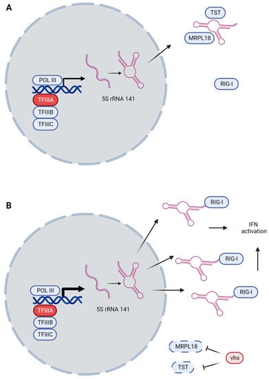 Guard mechanism of RNA5SP141 and RIG-I. (A) During homeostasis, POL III transcribes RNA5SP141 at low levels, with the product staying mostly in the nucleus. When escaping to the cytosol, the RNA is sequestered by MRPL18 and TST, preventing it from activating RIG-I. (B) Upon HSV-infection, vhs causes global mRNA downregulation, decreasing the amounts of MRPL18 and TST. RNA5SP141 is slightly upregulated, but importantly, the transcript is shifted from the nucleus to the cytoplasm where it, disinhibited by the lack of MRPL18 and TST, can activate RIG-I and induce IFN-dependent immunity. TFIIIA (red, encoded by GTF3A) is part of the transcription factor complex necessary for POL III-transcription of 5S rRNA species.