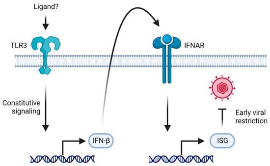 TLR3 as a rheostat of tonic IFNAR signaling. In healthy individuals, TLR3 signals constitutively, leading to a basal level of IFN-β which activates IFNAR signaling. The resulting basal level of ISGs being expressed restricts early viral replication. In patients deficient in the TLR3-IFNAR-signaling axis, the virus replicates at a higher rate early during the infection, predisposing to HSE.