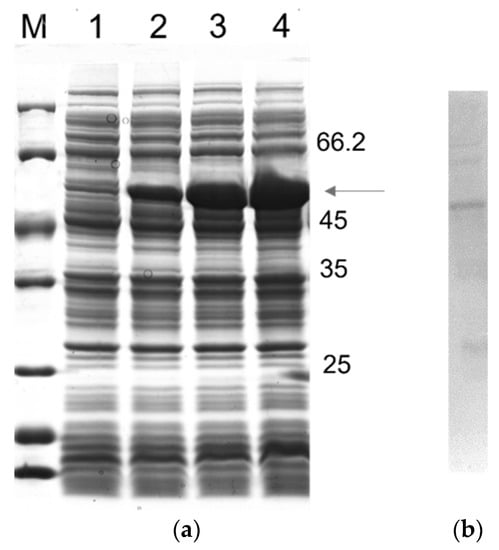 Time course rTC expression in E. coli BL21 (λDE3) and analysis using SDS-PAGE 12%: (a) Lane M, unstained protein molecular mass marker (Thermo Scientific); Lane 1, noninduced control; Lanes 2–4, after 0.5, 1.5, and 2.5 h of induction, respectively. (b) Western blotting analysis. The monoclonal antibody, anti-polyhistidine conjugated horseradish peroxidase (HRP), was diluted 1:1000 in PBS.