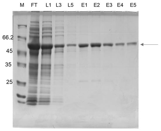 Analysis of the rTC using 12% SDS-PAGE after the purification procedure. Fractions were collected after Ni-NTA chromatography. Lane 1: M, molecular mass markers: Unstained Protein Weight Marker Standards (Thermo Scientific). Lane 2: FT: flow-through (unbound fraction); Lanes 3–5: L1, 2 e 3: wash steps; Lanes 6–10: E1, 2, 3, 4 e 5: purified rTC after elution with 100 mM imidazole.