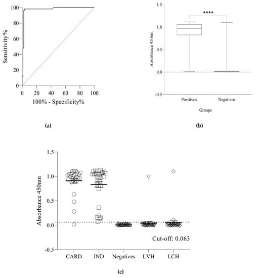 (a) ROC curve showing the in-house ELISA’s area under the curve (AUC). (b) Boxplots of the absorbance readings from the sera in the positive and negative groups presented statistically significant differences, the asterisk indicates statistical significance (**** Mann-Whitney U: p < 0.0001). The median of absorbance readings obtained using the in-house ELISA in the positive group was 0.969, 25% percentile = 0.825, 75% percentile = 1.059. In contrast, the median of absorbance readings obtained using the in-house ELISA in the negative group was 0.012, 25% percentile = 0.004, 75% percentile = 0.024. (c) Reactivity and positivity of the in-house ELISA were measured in serum samples of positive groups (cardiac form (CARD) n = 28 and indeterminate form (IND) n = 30) and negative controls groups (NI), healthy individuals (HI) n = 30, human visceral leishmaniasis (LVH) n = 30, and human cutaneous leishmaniasis LCH n = 30). The cut-off was determined as 0.063. The sensitivity and specificity were 98.28 (95% CI: 90.86–99.91) and 96.67% (95% CI: 90.65–99.09%) respectively. Three samples from the negatives group showed false-positive results. In the Kruskal–Wallis test, we did not observe a significant difference between the diagnosis (p > 0.9999) of the IND and CARD clinical forms, only with NI (p < 0.0001).