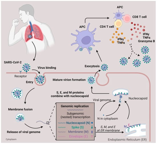 Within lethal contagious respiratory viruses, the most prevalent transmission route is an airborne infection [8]. In Figure 1, when the SARS-CoV-2 reaches the lung’s epithelial layer, the spike protein on the viral surface will bind with the ACE2 receptor, accelerating the entry of the virus [9,10]. Fusion of the virus and host cell membrane results in the release of the viral genome [11]. Essential components (including N, S, M, and E proteins) and sub-genomic viral RNA are subsequently generated and assembled to form an intact virus [12]. The newly generated virus is released from the cytoplasm through exocytosis [12] and SARS-CoV-2 will be captured by antigen-presenting cells (APC). Viral antigens are then processed and presented to the T cells [13,14]. Meanwhile, the defense mechanism mediated by T cells with SARS-CoV-2 is different from the antibody-dependent response due to their ability to recognize a broad range of viral epitopes [13,15]. Compared with the common cold, SARS-CoV-2 infection generates a diverse epitope pool and increases the frequency of both viral-epitope-specific CD4+ and CD8+ T cells among convalescent SARS-CoV-2 patients [13]. In terms of infection, T cells secrete IFNγ, Granzyme B, and TNFα to help eliminate SARS-CoV-2 infected cells [16]. In mild COVID-19 patients, the effector CD4+ or CD8+ T cells will proliferate and form a defense mechanism during the acute phase [17]. In moderate-symptom patients, the natural killer T cell (NKT) CD160 population responds quickly by direct cytotoxicity [18]. Furthermore, the SARS-CoV-2-specific memory T cells are beneficial for providing essential protection against future reinfection [15,19,20,21].
