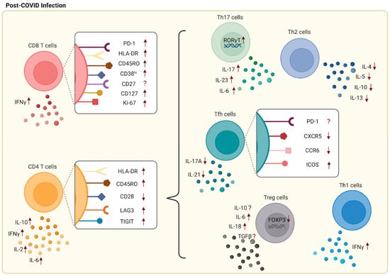 Changes in surface markers and cytokines following SARS-CoV-2 infection. Increased expression of surface markers including PD-1, Ki-67, HLA-DR, CD45RO, CD38hi, and CD127 was found on CD8+ T cells, while CD27 shows a contradicting result. Upregulation of LAG-3, TIGIT, HLA-DR, and CD45RO as well as downregulation of CD28 were detected on CD4+ T cells. Included in CD4 T cell subsets are Th1, Th2, Th17, Tfh, and Treg cells. Increased populations of Th1 cells along with the production of IFNγ predominated following SARS-CoV-2 infection. Conversely, low numbers of Th2 cells along with abnormal secretions of associated cytokines were found in mild patients. As for Tfh cells, lower expressions of CXCR5 and CCR6 and higher expression of ICOS were observed, while PD-1 expression had conflicting results. There were contradicting studies for Treg cells with some suggesting that high populations of Treg cells were associated with increased secretion of IL-10, TGF-β, IL-6, and IL-18. On the other hand, some researchers indicated a reduction in Treg cells, with lower expression of FOXP3, TGF-β, and IL-10. Lastly, an increased percentage of Th17 cells with high expression levels of RORγt and increased secretion of signature cytokines are found post-SARS-CoV-2 infection.
