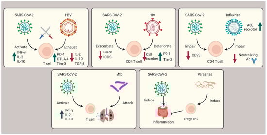 Role of T cells during coinfection with viruses, bacteria, and parasites. In SARS-CoV-2 coinfection with HBV, exhausted T cells are caused by HBV infection and subsequently countered with SARS-CoV-2 infection cytokine storms. In HIV coinfection, CD4+ T cells are corrupted, leading to exacerbated patient outcomes. Influenza coinfection decreases neutralization antibody efficacy and increases ACE2 receptors, overall boosting SARS-CoV-2 infection. For Mtb coinfection, both infections will affect the lung tissue, resulting in respiratory failure. In coinfection with parasites, Th2 and Treg cells are induced to suppress the immune system and ameliorate the intestinal inflammation severity of SARS-CoV-2.