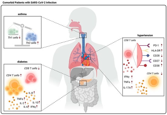T cells’ response in comorbid patients with SARS-CoV-2 infection. There is a disproportionate ratio of Th1/Th2 cells as well as lower populations of Th2 cells in asthmatic patients following SARS-CoV-2 infection. CD4 T lymphopenia is observed in hypertensive patients with SARS-CoV-2. Surface markers such as PD-1, HLA-DR, and CD38 are highly expressed while CD27 and CD28 are lightly expressed in CD8 T cells. In addition, there is a reduction in CD8 T cells and an elevation in CD4 T cells with cytokines IL-2, IL-6, IL-8, IL-10, IFNγ, and TGFβ in diabetic patients with SARS-CoV-2 infection.