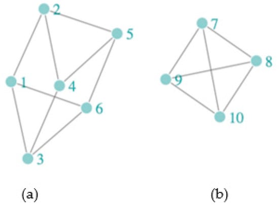 A sample network with two components, (a) Component 1 = {1, 2, 3, 4, 5, 6} and (b) Component 2 = {7, 8, 9, 10}, with participants (nodes) denoted by light-green circles and connections (edges) denoted by gray lines. The nearest neighbors of participant (node) 2 are {1, 4, 5}, of participant (node) 3 are {1, 4, 6}, and of participant (node) 6 are {1, 3, 5}.