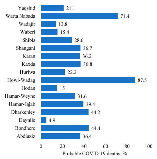 A total of 530 deaths were captured through the verbal autopsy between March and October 2020. Based on the WHO case definition, 176 (33.2%) of these deaths were attributable to COVID-19 because the deceased persons were reported to have had the characteristic COVID-19 symptoms (fever, loss of taste and/or smell, and difficulty in breathing). The proportion of COVID-19-associated deaths varied across the districts in Banadir, from 4.9% to 87.5% of all deaths (Figure 1).