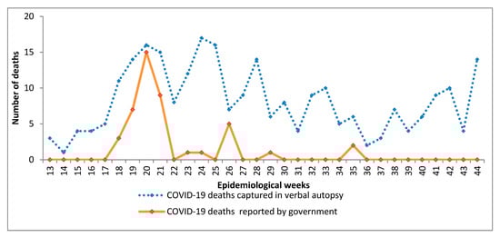 Trends in deaths found using the two approaches followed the same pattern (Figure 2). COVID-19 deaths recorded in government reports were similar to deaths found through verbal autopsies in epidemiological week 20 but after week 22, COVID-19 deaths found through verbal autopsy were consistently higher than the government reports. The government did not report any COVID-19 deaths between week 36 and week 44.