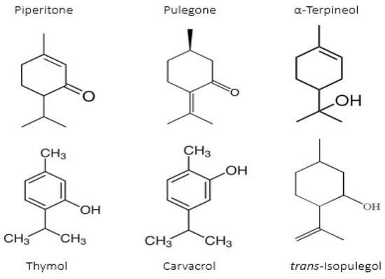 A great example of the strong relationship between the molecular structure of a compound and its possible biological properties can be found in the p-menthane type monoterpenoids Figure 1. The differences between these molecules, even if they appear insignificant at first glance, can be very important when considering the biological properties of these compounds, even if some are only mutually isomeric, differ in opposition to double bonds, and others have different functionalities/hetero atoms []. As an example, carvacrol, a compound isomer to thymol, was found to have antimicrobial effects primarily via cytoplasmic membranes, where the effect of carvacrol is enhanced by its hydroxyl group, which acts as a transmembrane carrier of monovalent cations, disrupting the membrane potential [,], while thymol, another aromatic p-menthane type monoterpene phenol, is thought to interact with both inner and outer membranes of the cell by integrating in the polar headgroup region of the lipid bilayer, increasing its permeability [].