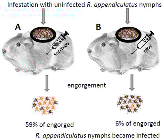 Experimental design in the publication by Jones et al. []. Each individual guinea pig in both experimental groups (A,B) was infested with 50 or 70 uninfected R. appendiculatus nymphs. Subsequently, guinea pigs from group A (7 animals) were injected with a mixture of salivary gland extracts (SGE) from uninfected R. appendiculatus or A. variegatum female ticks fed for 5 days and Thogoto virus (THOV, 5 × 103 PFU), while guinea pigs in experimental group B (3 animals) were injected only with the same dose of THOV as in group A. Twelve days post engorgement, the presence of virus in individually homogenized nymphs was detected by plaque titration on Vero cells.