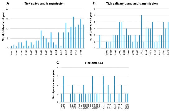 Summary of scientific publications (1989 till present) dealing with (A) tick saliva or (B) tick salivary gland and pathogen transmission and (C) tick and SAT.