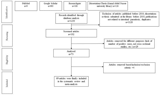 A total of 1230 studies were initially identified in the queried databases. Overall, 1128 studies were excluded during the first selection phase according to the following reasons: exclusion of articles published before 2010, dissertations or theses submitted at the library before 2010, publications not related to intestinal parasitosis, and duplicates. Out of the 102 publications or documents, after a second selection phase, 69 studies met the study criteria (Figure 1).