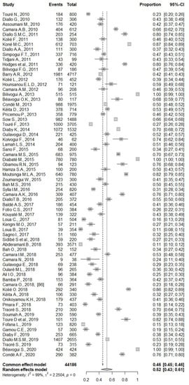 In the current study, the pooled prevalence of soil-transmitted helminth infections was 12%. This prevalence was less than the ones reported in Rwanda (25.4%), Cameron (24%), Nigeria (54.8%), and Ethiopia (37%) [97].