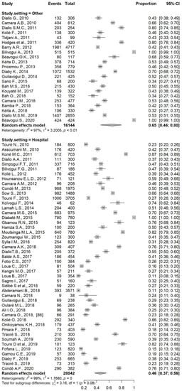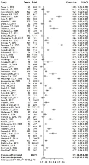 Before 2010, the prevalence of intestinal parasitosis in Guinea, according to the literature, was over 50% [4,88,89]. In this meta-analysis, this prevalence appears to vary from one study to another, sometimes over the same study period. However, even if a decrease in prevalence was observed here in P3 when compared to P1 or P2, prevalence remained high in all localities of the country. This slight decrease could be explained by the intensification of mass campaigns for the distribution of antiparasitic drugs in these localities [16]. However, the calculation of prevalence for P1 is based only on a limited number of studies that were available according to inclusion criteria and probably this is underestimating and not reflecting the real prevalence. In addition, it is well known that during the 2014–2016 Ebola virus disease (EVD) outbreak, routine health activities slowed down, including community-based activities such as deworming campaigns [3].